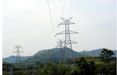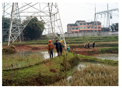 圖三:四川省強(qiáng)波電力工程有限公司在2005年承建的東觀500KV變電站220KV出線金南線工程,圖為該工程N(yùn)77號塔正在按標(biāo)準(zhǔn)化作業(yè)進(jìn)行放緊線施工。